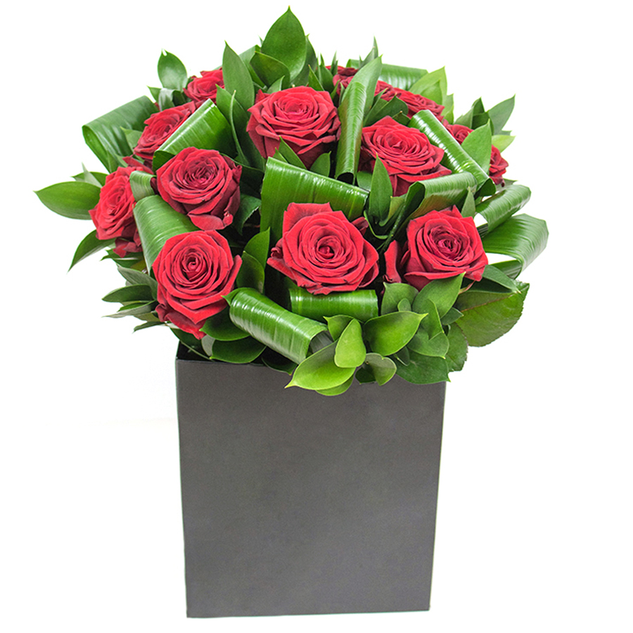 This arrangement boasts an exquisite blend of vibrant red roses with lush greenery. It made the perfect gift for someone very special.