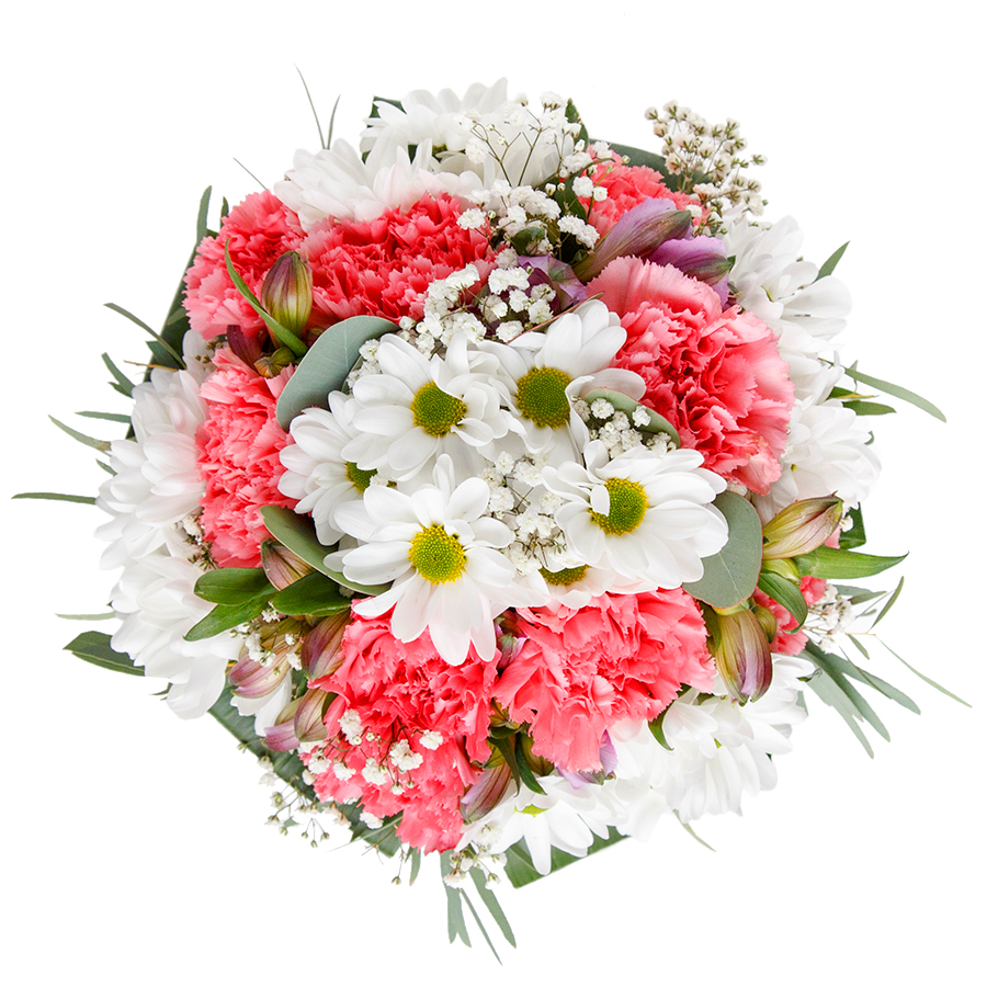 Embrace elegance with our graceful flower arrangement, showcasing a beautiful combination of white chrysanthemums, soft pink carnations, delicate gypsophila, and lush aspidistra leaves. Each flower is hand-selected for superior freshness and quality.